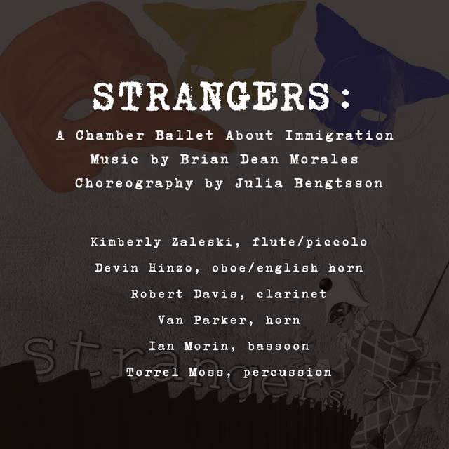 Composer Brian Morales and Choreographer Julia Bengtsson have teamed up to create the dynamic chamber ballet: Strangers. The work calls for a woodwind quintet, percussion and 4 dancers and goes for 45 minutes in duration. It covers themes of immigration using abstract metaphors and Commedia del Arte characters. Using folklore and fables, our migrant character, Zanni, traverses the stage for a better life.